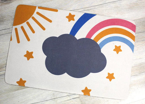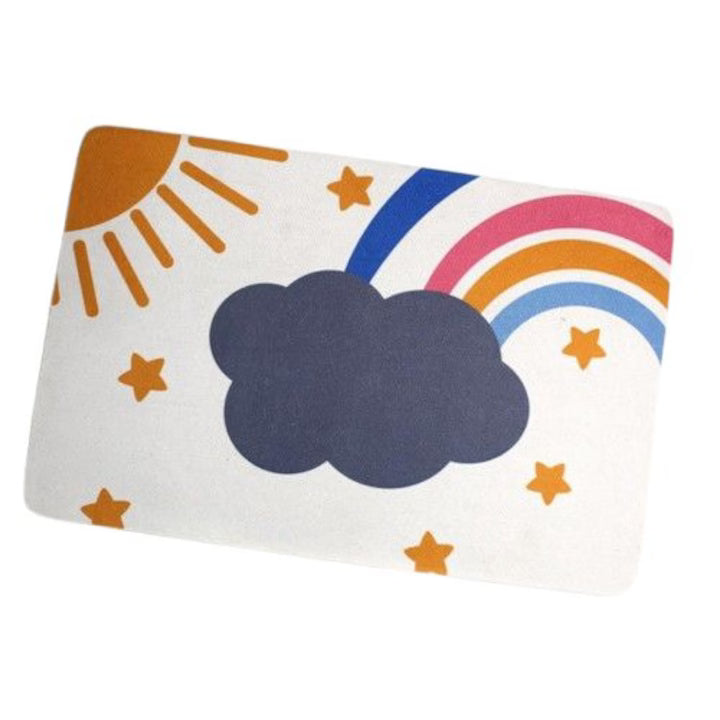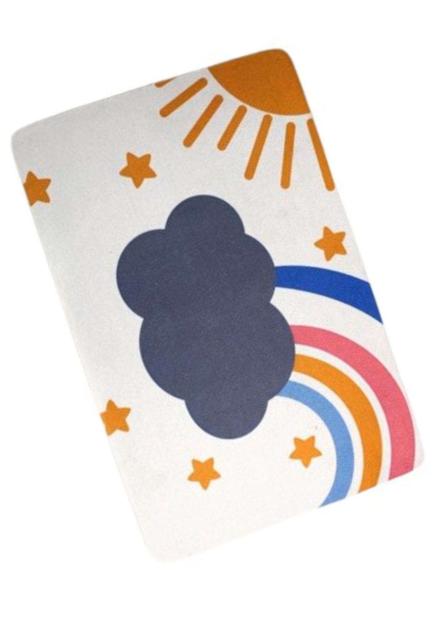 Covoraș de casă, cu design vesel și prietenos, ilustrând un nor pufos, curcubeu, soare și steluțe. Este ideal pentru camera copilului, spații de joacă sau baie, adăugând culoare și o atmosferă caldă și liniștitoare.