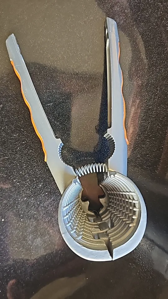 Acesta este un clește pentru spart nuci, realizat din metal rezistent, prevăzut cu mânere din lemn pentru o prindere confortabilă și sigură. Partea superioară conține o cavitate zimțată, concepută pentru a fixa ferm nucile de diferite dimensiuni, facilitând spargerea lor cu efort minim.
