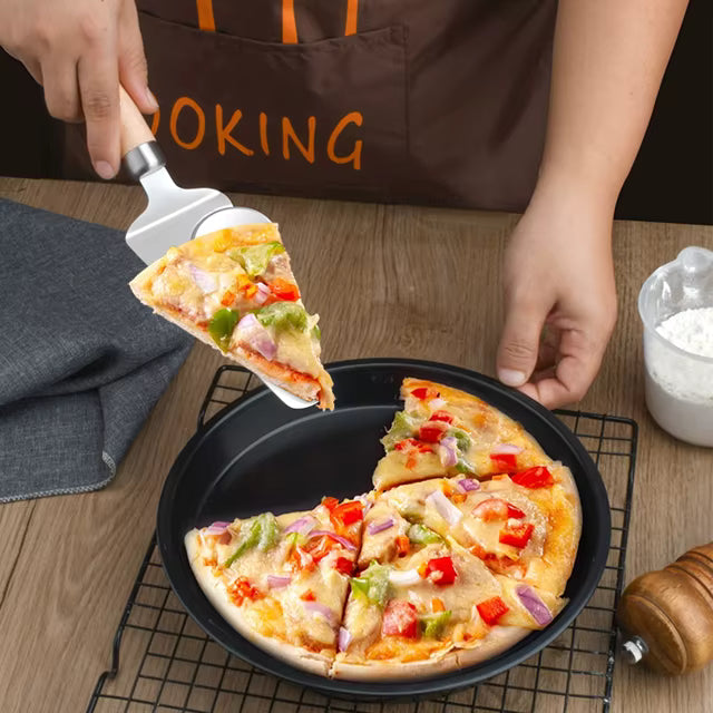 Spatula cu cuțit integrat este un accesoriu practic și versatil pentru bucătărie, ideal pentru tăiere, porționare și servire. Designul inteligent combină o lamă zimțată cu o rotiță de tăiere, fiind perfectă pentru pizza, tarte, plăcinte, clătite sau alte preparate coapte. Mânerul ergonomic din lemn oferă confort și control sporit în utilizare.