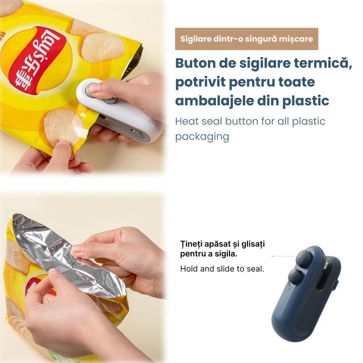 Acest dispozitiv este un sigilator termic portabil, conceput pentru a resigila ermetic pungi din plastic sau folie după ce au fost deschise. Folosește căldura pentru a topi și a uni marginile pungii, creând o sigilare etanșă. Designul său compact și faptul că este reîncărcabil îl face extrem de util în bucătărie, acasă sau chiar în călătorii, pentru a menține alimentele proaspete.