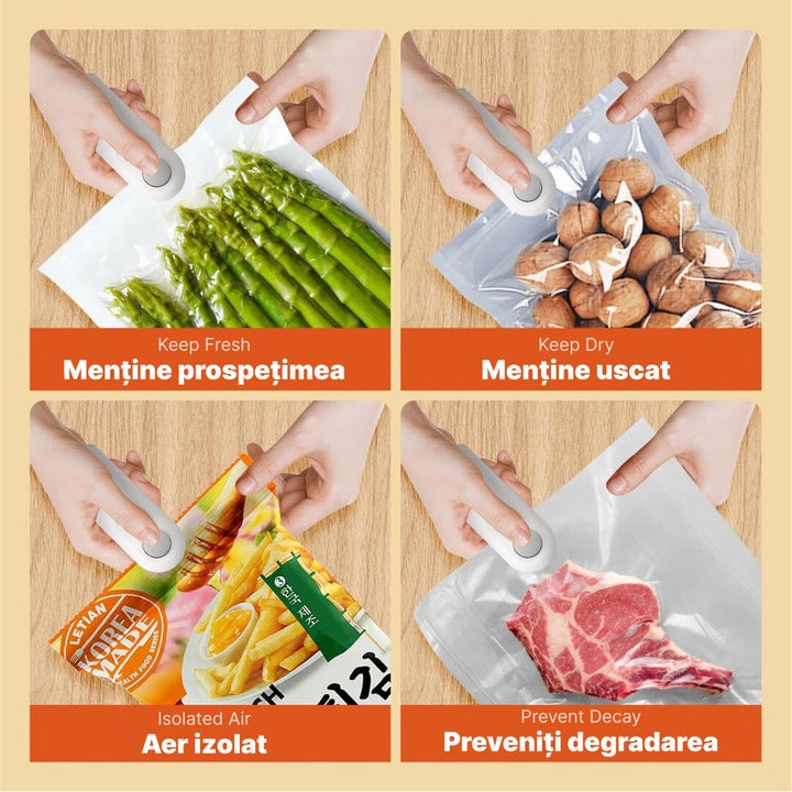 • Cel mai important beneficiu este că ajută la menținerea prospețimii alimentelor (gustări, cereale, cafea, condimente) prin sigilarea ermetică a pungilor deschise. Acest lucru previne intrarea aerului și a umidității, încetinind procesul de deteriorare.