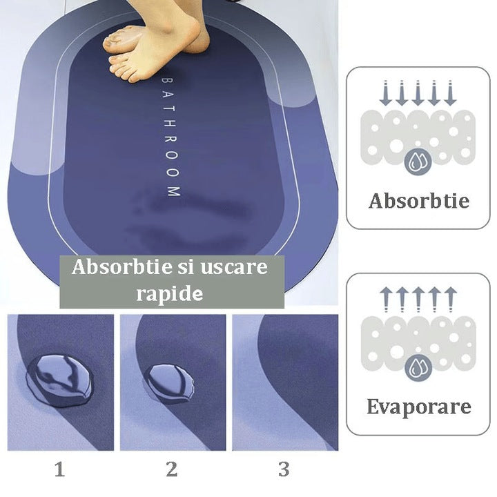 • Materialele speciale (spumă cu memorie, microfibră sau piatră diatomită, în unele cazuri) absorb eficient apa de pe tălpi, menținând podeaua uscată.