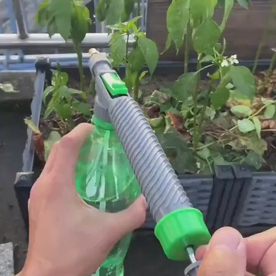 Pulverizator cu pompare manuală, compatibilă cu sticle de plastic obișnuite (PET), folosită pentru udare, curățenie sau aplicarea tratamentelor fitosanitare.