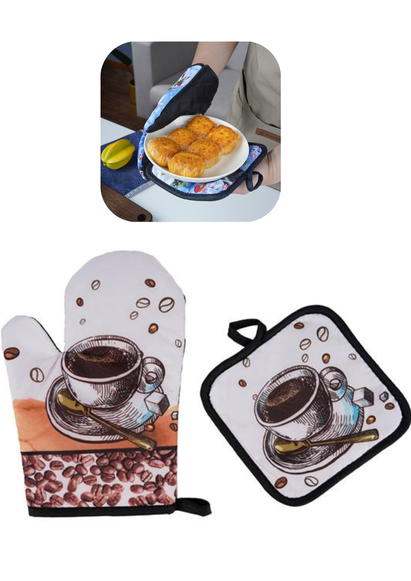 Setul format din mănușă termoizolantă și suport pentru vase fierbinți, cu design decorativ inspirat din lumea cafelei, este accesoriul ideal pentru orice bucătărie. Practic, sigur și estetic, acest set îți oferă protecție eficientă împotriva temperaturilor ridicate și adaugă un plus de stil spațiului tău.