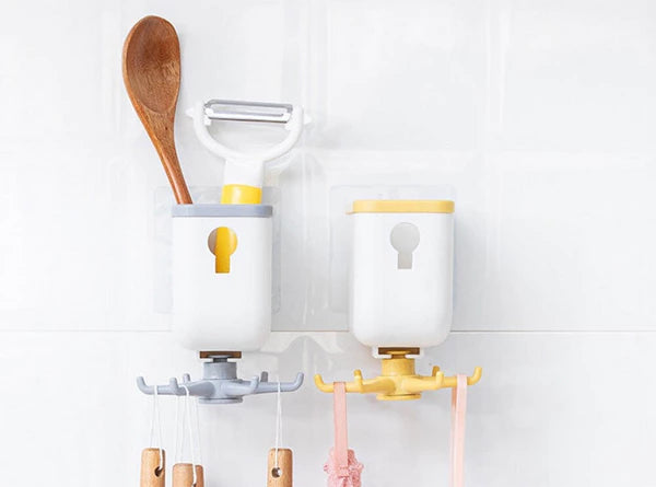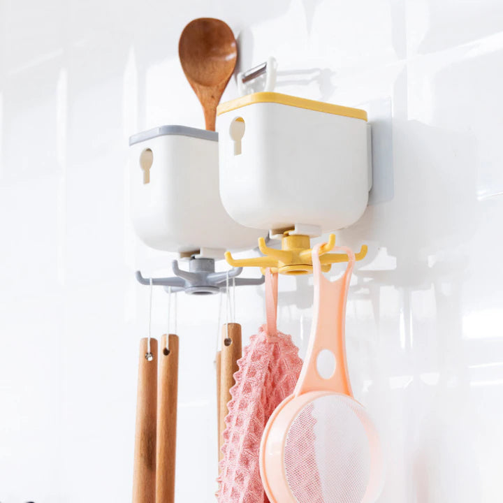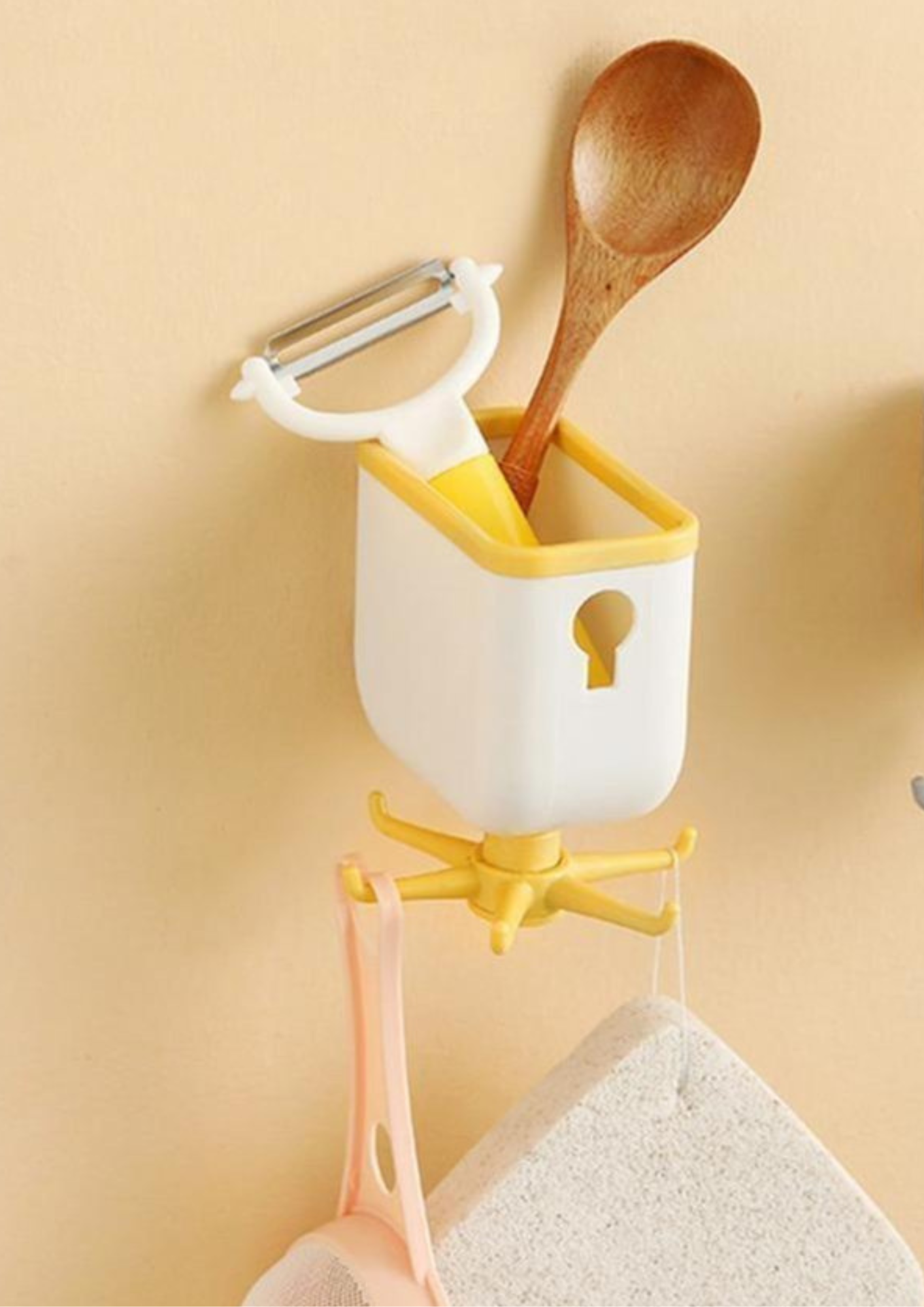 Acest suport rotativ pentru tacâmuri și ustensile de bucătărie este soluția ideală pentru a păstra blatul ordonat și accesibil. Realizat din plastic durabil, cu un design modern în două culori, suportul dispune de un recipient spațios pentru ustensile și o bază rotativă cu cârlige multiple, perfectă pentru agățarea accesoriilor mici. Este compact, ușor de curățat și oferă o organizare eficientă în orice bucătărie.